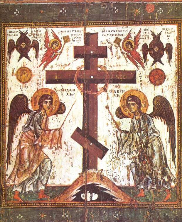 Рис.2.60. Обратная сторона известной русской иконы "Спас Нерукотворный". Конец XII века. Взято из [308], оборот титульного листа. См. также [462], икона 9 (здесь изображение зеркально перевернуто). Два ангела держат в руках орудия казни Христа - копье и шест с губкой.