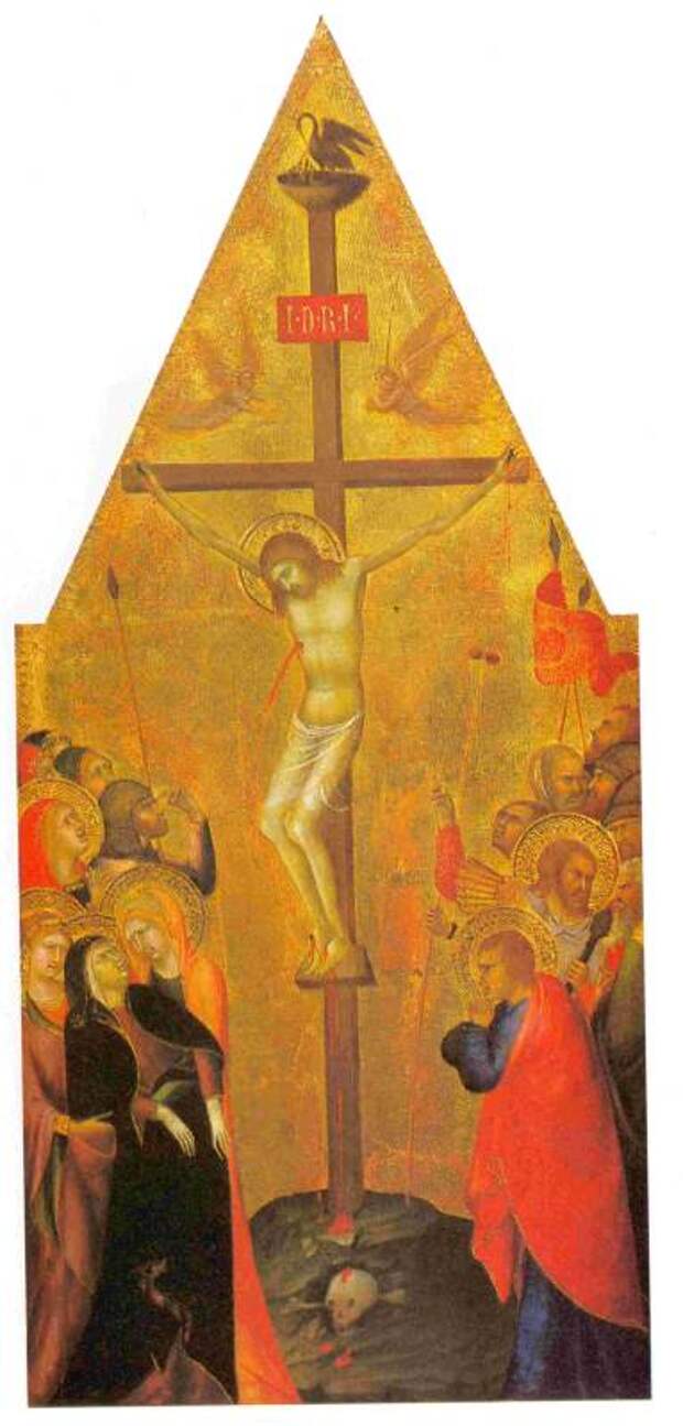 Рис.2.61. "Распятие". Липпо Мемми. Якобы 1317-1347 годы. Воины, стоящие около креста, держат в руках копье и палку, на конце которой находится губка. Копье и губка - орудия казни Христа, находящиеся в руках его врагов. Взято из [493:1], с.34.