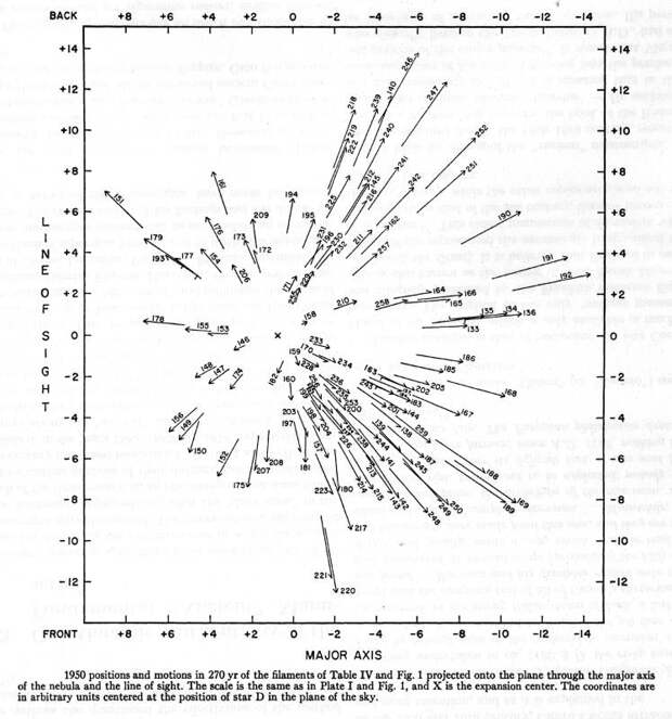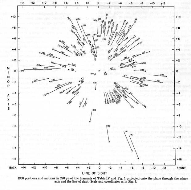 Вскоре эта приблизительная дата была значительно уточнена американским астрономом В.Тримбл [1463:1]. "В 1968 г. Тримбл выполнила важное измерение собственных движений 132 волокон Крабовидной туманности по фотографиям, полученным на 100- и 200-дюймовых телескопах обсерватории Маунт Паломар (V.Trimbl. AJ 73, 535, 1968). Фотографии были получены через фильтр... что обеспечивает отличную четкость изображения системы волокон... Фотографии, использованные Дунканом, были выполнены без фильтра и имели меньший масштаб. Тримбл использовала при обработке этих фотографий полученные разными авторами лучевые скорости 127 волокон. На рис.1.3 приведены проекции векторов смещения разных волокон за 270 лет" [978], с.223-225. На рис.1.3 и рис.1.4, взятых нами из оригинальной статьи В.Тримбл [1463:1], изображены проекции векторов смещения (по отношению к точке наблюдения с Земли) на две плоскости, проходящие через луч зрения и большую и малые оси Крабовидной туманности соответственно. Указанные 270 лет задают здесь условный интервал времени, для которого было рассчитано и графически изображено смещение "осколков" звезды [1463:1].