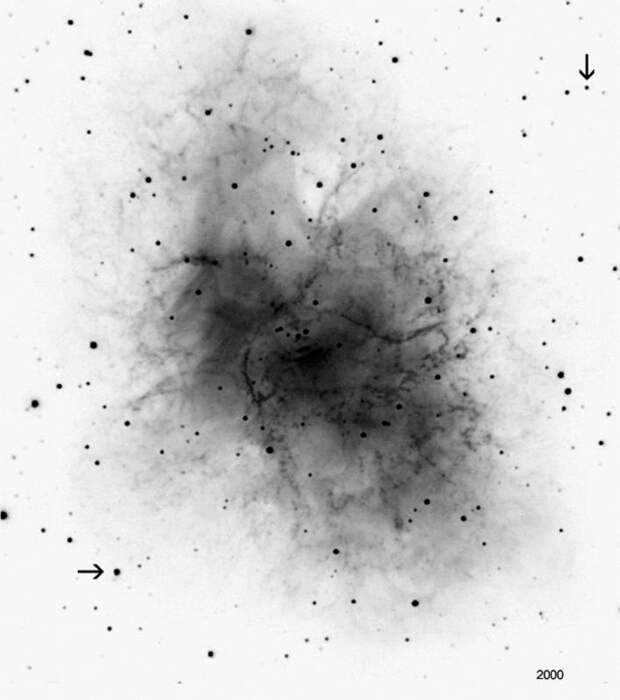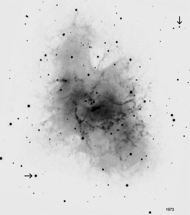 В.Тримбл было обнаружено, что <<эти векторы сходятся к малой области - центру взрыва, - смещенной на 12" к юго-востоку от южной звезды в центральной части туманности, которая, как сейчас доказано, является звездным остатком вспышки сверхновой 1054 г. Точность определения точки схождения векторов скоростей волокон составляет 3". При постоянной скорости движения волокон они должны были все находиться в малом объеме около 1140 плюс-минус 10 лет>> [978], с.223-225.