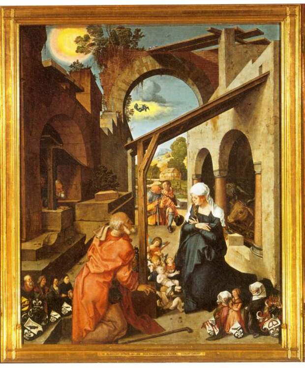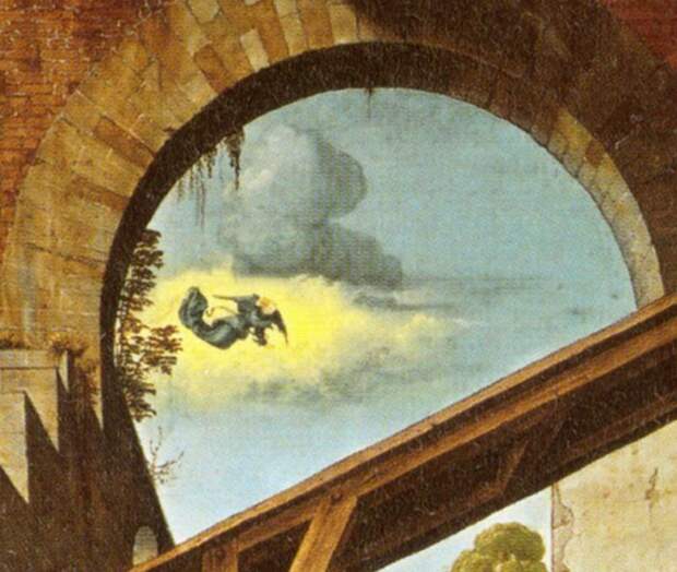 Аналогичное изображение именно двух небесных "вспышек", возвестивших о рождении Христа, мы видим и на известном средневековом алтаре Паумгартнеров, созданном Альбрехтом Дюрером якобы в XVI веке. Центральная его композиция "Рождество" приведена на рис.1.11. Мы видим шаровую вспышку Вифлеемской звезды, а чуть ниже (как, кстати, и на картине Альтдорфера) - вытянутое клубящееся светило с ангелом внутри, см. рис.1.12. На обеих приведенных картинах пара небесных светил изображена ярко-желтым, золотистым цветом, сразу бросающимся в глаза на более темном фоне остального пейзажа. На рис.1.12a Вифлеемская звезда тоже изображена как "звезда с хвостом", то есть как комета.