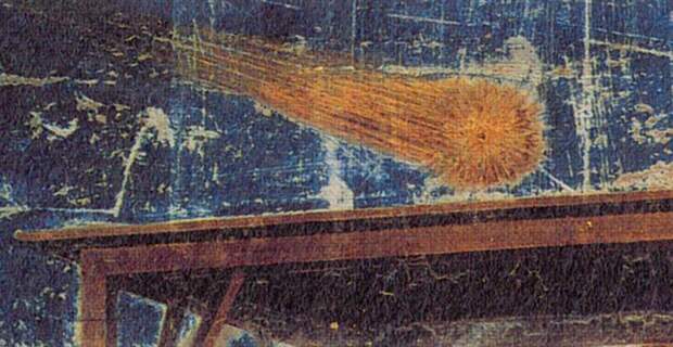 ДОБАВЛЕНИЕ О КОМЕТЕ ГАЛЛЕЯ. Сегодня известно, что период возвращения кометы Галлея составляет примерно 76 лет. См., например, обсуждение этого вопроса в книге "Империя". Поскольку в предпоследний раз комета Галлея появилась в 1910 году, то легко подсчитать, что около 1910 - 760 = 1150 года комета Галлея также должна была появиться. Хорошо или плохо она была видна в тот год - мы не знаем. Но если она действительно возникла на небе столь же эффектно, как в XVII-XX веках (например, как в 1910 году), то в течение нескольких лет на небе могли наблюдаться два ярких явления - вспышка звезды около 1150 года и комета Галлея около 1150 года. Что, естественно, должно было еще более усилить впечатление людей. Впоследствии два явления могли путаться, объединяться. В Евангелиях сказано, что Вифлеемская звезда ДВИГАЛАСЬ, вела волхвов. Что напоминает поведение кометы: "И се, звезда, которую видели они на востоке, ШЛА ПЕРЕД НИМИ, КАК НАКОНЕЦ ПРИШЛА И ОСТАНОВИЛАСЬ над местом, где был Младенец" (Матфей 2:9). На рис.1.7 приведено одно из старинных изображений евангельской Вифлеемской звезды именно в виде "хвостатой звезды". Так ранее изображали кометы. Еще более откровенное изображение Вифлеемской звезды в виде кометы мы видим на картине Джотто "Поклонение волхвов", см. рис.1.8. Хвост у звезды вытянут влево вверх - значит художник, скорее всего, рисовал именно комету а не, скажем, звезду с лучом указывающим на младенца Христа, см. рис.1.9.
