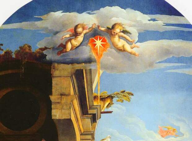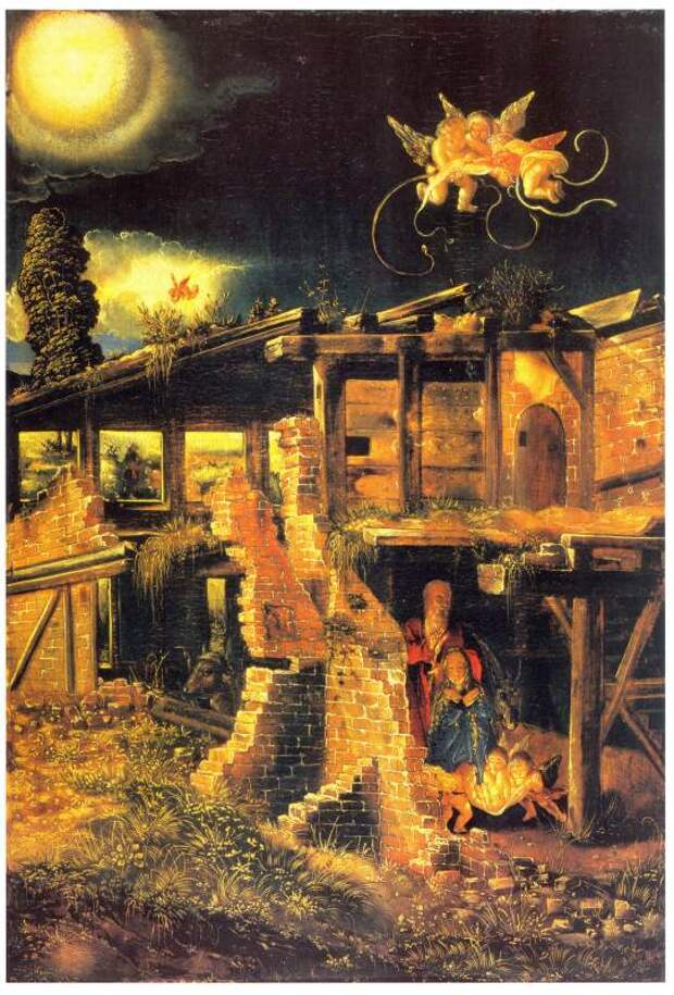 Любопытно, что на средневековой картине "Рождество" Альбрехта Альтдорфера вверху слева изображены ДВА НЕБЕСНЫХ СВЕТИЛА, ознаменовавшие Рождество, см. рис.1.10. Одно из них - огромная Вифлеемская звезда в виде шаровой вспышки. А чуть ниже - более вытянутое и клубящееся светило, внутри которого изображен небольшой ангел.
