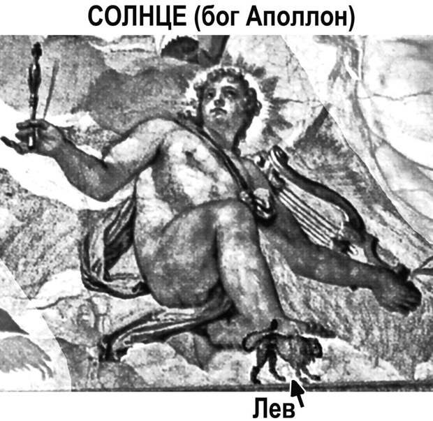 . Как и на зодиаке Астрономии, Солнце изображено здесь в виде бога Аполлона над созвездием ЛЬВА. Ср. с рис.156