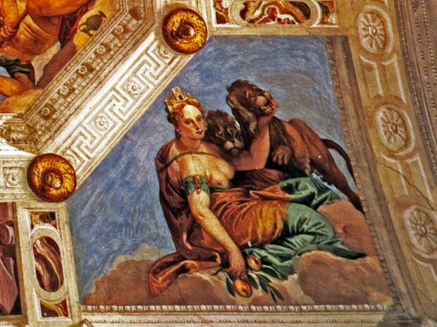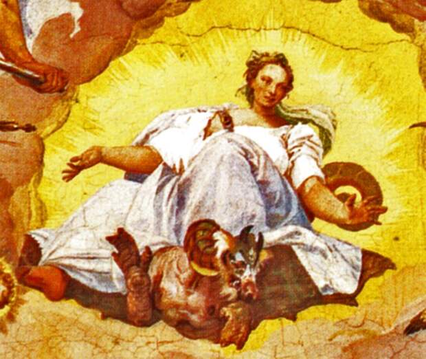 . Здесь достаточно откровенно изображена Венера во Льве. Золотистые яблоки в руках женщины подчеркивают ее отождествление с Венерой. Ведь, согласно знаменитой легенде, именно богине Венере Парис присудил золотое яблоко.