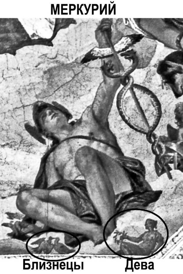 . Он легко узнается по своему известному жезлу, обвитому змеями - "жезлу Меркурия". Меркурий сидит над фигурами созвездий БЛИЗНЕЦОВ и ДЕВЫ. Значит, Меркурий был между Близнецами и Девой. Опять мы видим то же самое, что и на зодиаке Астрономии, см. рис.48 выше.