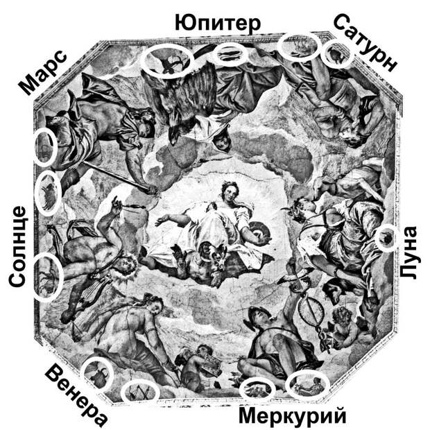Вдоль границы восьмиугольника изображены 12 зодиакальных созвездий, над которыми восседают семь олимпийских богов-планет, рис.130