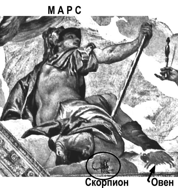 . Марс нарисован здесь в виде воина, в воинском шлеме. Он сидит над созвездиями СКОРПИОНА и ОВНА. С этими же созвездиями Марс изображен и на зодиаке Астрономии, см. рис.150