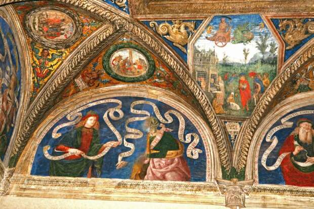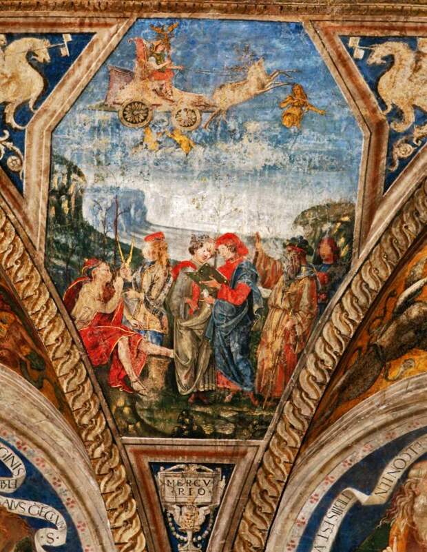 . Эти восемь изображений делятся на четыре прямоугольных картины, помещенных по сторонам зодиака и четыре угловых, треугольных картины.