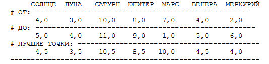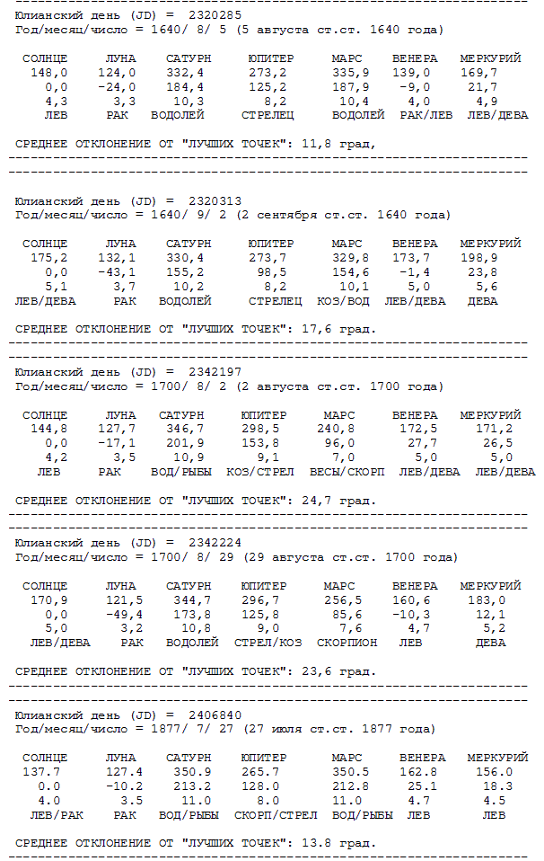 Значения среднего отклонения от "лучших точек" удовлетворительны для всех полученных решений. Хотя некоторые из них и превышают 20 градусов, что обычно плохо, но надо учесть, что положения двух планет - Марса и Меркурия - заданы в гороскопе весьма неточно. Это, вообще говоря, увеличивает среднее отклонение.