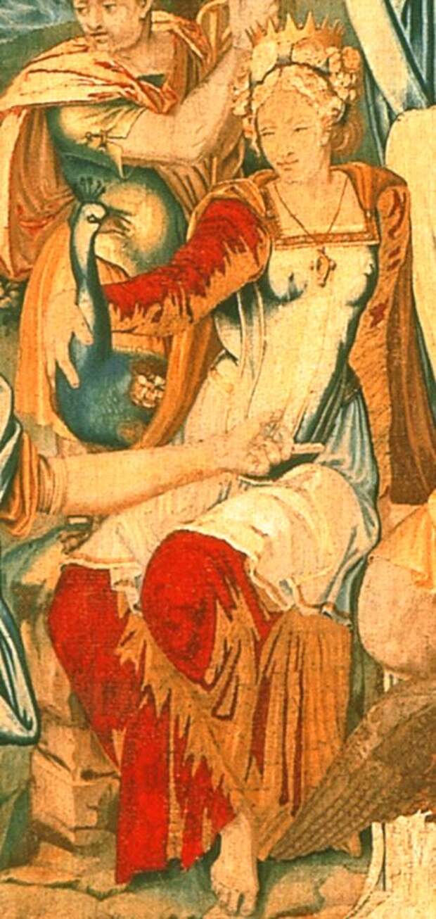 Здесь никаких полумесяцев нет. Зато явно подчеркнута красота женщины. Поэтому, скорее всего, это ВЕНЕРА. Кстати, на руках у нее сидит ФАЗАН. Но мы уже знаем, что именно Венера рисовалась на европейских зодиаках в обнимку с фазаном. См., например, наше исследование французского зодиака Дианы Пуатье (зодиак DP) в книге "Египетские, русские и итальянские зодиаки" [ЕРИЗ]. Там Венера сидит с фазаном на коленях, рис.148