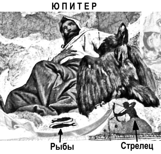 . Орел - известный символ Юпитера, часто встречающийся на европейских зодиаках [ДЗ], [ЕРИЗ]. Юпитер сидит над знаками созвездий РЫБ и СТРЕЛЬЦА. Значит, Юпитер находился между Стрельцом и Рыбами (включая эти два созвездия). То же самое мы видели и на зодиаке Астрономии, см. рис.52 выше.