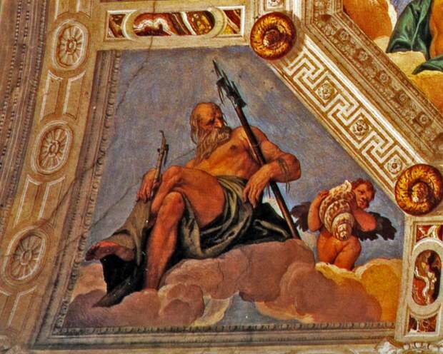 . Как мы уже неоднократно убеждались, Нептун на европейских зодиаках обозначает планету Сатурн [ЕРИЗ]. Рядом с Нептуном-Сатурном нарисован ангелочек с большой раковиной в руках, подобной сосуду с водой. Раковина-сосуд может обозначать на зодиаках созвездие Водолея. Никаким другим зодиакальным созвездиям раковина не соответствует. Таким образом, из данного изображения мы извлекаем еще одно важное астрономическое дополнение к гороскопу: САТУРН БЫЛ В ВОДОЛЕЕ.