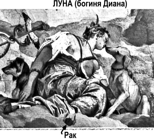 . Она изображена в виде Дианы - богини Луны, с полумесяцем в волосах. Под Дианой-Луной показано созвездие РАКА. Значит, Луна была в Раке - так же, как и на зодиаке Астрономии, см. рис.44 выше.