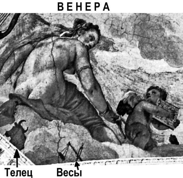 5) Затем совершенно откровенно изображена ВЕНЕРА в виде полуобнаженной женщины, рядом с которой сидит купидон, рис.137. Венера расположена над фигурами созвездий ТЕЛЬЦА и ВЕСОВ. На зодиаке Астрономии было то же самое, см. рис.54 выше.