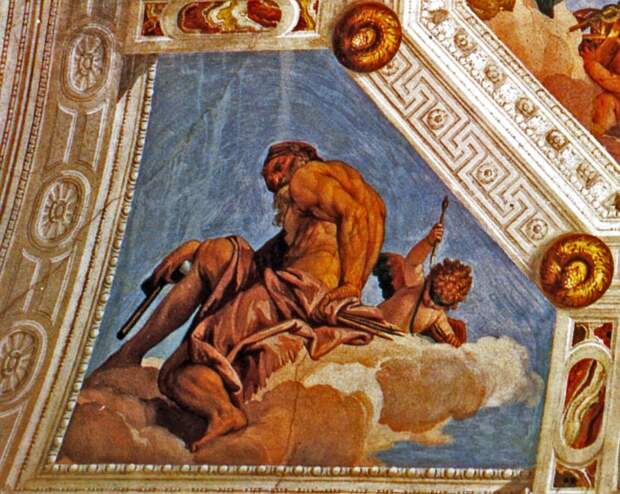 Далее, как мы уже знаем из нашего исследования самых различных зодиаков - как египетских, так и европейских - с бородами изображались чаще всего "старшие" планеты: Юпитер и Сатурн. Но поскольку Сатурн, как мы видели, находился в Водолее, а не в Стрельце, то, значит, здесь изображен ЮПИТЕР. И действительно, нетрудно заметить отчетливые признаки Юпитера на данной картине. Вспомним, что согласно мифологии, Юпитер мечет громы и молнии на землю. Именно он - повелитель громов и молний. Обратим внимание, что бородатый мужчина изображен с молотом и стрелами. Но молот, который с грохотом бьет по наковальне, вполне может обозначать гром. А молнии могли изобразить здесь в виде пучка стрел. Получается, что ЮПИТЕР ПОКАЗАН В СТРЕЛЬЦЕ.
