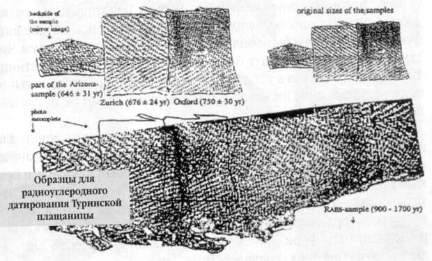 В 1988 году была выполнена нашумевшая радиоуглеродная датировка Туринской плащаницы. К тому времени методика радиоуглеродного анализа была усовершенствована до такой степени, что для датировки требовался лишь небольшой кусочек Плащаницы. В 1988 году в левом нижнем крае Плащаницы отрезали кусок размером примерно 10 х 70 мм. Затем его разделили на несколько частей и отослали в три различные радиоуглеродные лаборатории - Оксфорд (Англия), Аризону (США) и Цюрих (Швейцария). В каждой из лабораторий полученный кусок Плащаницы был разделен еще на несколько частей. Они были подвергнуты различным процедурам для удаления любых посторонних примесей, а именно, пыльцы, капель воска, масла, следов пальцев и т.д. Все, что могло попасть в ткань позднее, за прошедшие века, было из нее удалено [1082:1]. Вопрос о том - могли ли повлиять такие процедуры на радиоуглеродную датировку, вообще говоря, остается открытым, однако к разным кусочкам были применены существенно разные процедуры. Поэтому общего искусственного смещения дат в какую-либо одну сторону, скорее всего, не было.