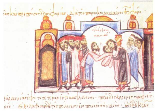 На рис.1.30 приведена миниатюра якобы XIII века, изображающая "возвращение Святой Плащаницы в Константинополь (якобы в 944 году - Авт.)... В начале иконоборческого периода (якобы в 726 году - Авт.) Плащаница была увезена в Эдессу. Показан момент передачи ее византийскому императору Роману I Лакапину" [244a], с.16.