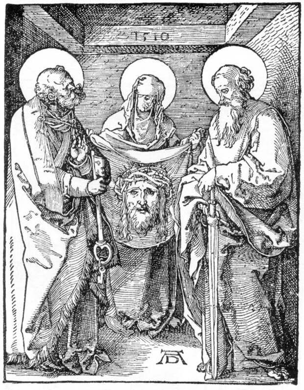 С точки зрения новой хронологии история Туринской плащаницы, то есть Нерукотворного Образа, по-видимому, выглядела так. Скорее всего, Плащаница = Нерукотворный Образ происходит из XII века. То есть ЯВЛЯЕТСЯ ПОДЛИННИКОМ. Это именно та Плащаница, в которую завернули тело Христа в 1185 году н.э. (подробнее об этой дате ниже). Затем, через какое-то время, она попала на Русь. Здесь она хранилась в свернутом виде - так, что на поверхности был виден только лик, который изображался на многочисленных русских иконах. Поскольку Плащаница находилась на Руси, иконы Нерукотворного Образа писали в основном русские художники. На Западе подобные изображения были мало распространены. Западные художники представляли себе историю Плащаницы в несколько ином виде. См., например, гравюру А.Дюрера на рис.1.27, а также германскую фреску на рис.1.27a. На Руси икону "Спас Нерукотворный" использовали также в качестве воинского знамени, хоругви. Мы цитируем: "Такой Спас украшал знамена ярославских, тверских и московских князей, выступал защитником русской земли и покровителем русского воинства. Под его стягами сражались в Куликовской битве" [308], с.97.