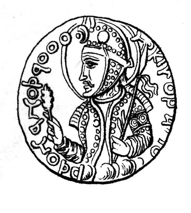 Рис. p1.20. Неизвестный “Античный” индо-скифский царь с христианским нимбом на медной монете. Взято из [817:2], с.190, лист IV.
