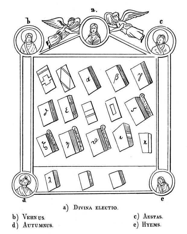 Рис. p1.13. “Античные” символы весны, лета и осени с христианскими нимбами по Notitia Dignitatum. Якобы V век н.э. Отметим, что зима, см. справа внизу, почему-то изображена без нимба. Взято из [817:2], с.190, лист II.