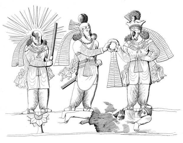 Рис. p1.18. “Античный” меченосец с христианским нимбом, сопровождающий сасанидского царя. Каменный рельеф. Взято из [817:2], с.190, лист III.