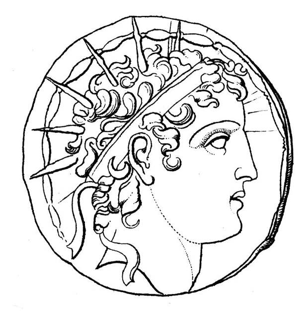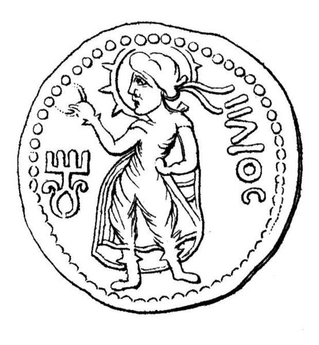 Рис. p1.25. “Античный” Антиох VI с христианским нимбом на серебряной монете. Взято из [817:2], с.191, лист IV.