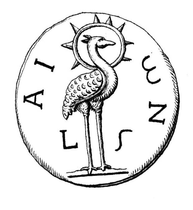 Рис. p1.27. “Античный” Феникс с христианским нимбом на серебряной монете императора Антонина Благочестивого, отчеканенной в Александрии. Взято из [817:2], с.191, лист IV.