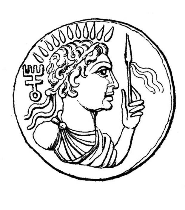 Рис. p1.21. “Античный” Митра-Гелиос с христианским нимбом на медной монете царя Канэрки. Взято из [817:2], с.191, лист IV.