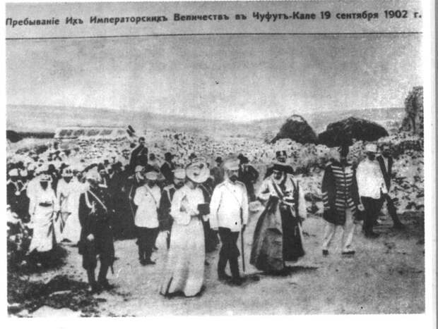 Как мы видим, поток посетителей Чуфут-Кале самого высокого ранга, включая императоров и императриц, не иссякал вплоть до начала XX века. На рис.4.110 приведена фотография посещения Николаем II Чуфут-Кале в 1902 году. В XX веке, после переворота 1917 года, ситуация изменилась и легендарные священные места Крыма надолго погрузились в забвение. Память о том, что тут провела свои последние дни Богородица, практически исчезла. И лишь сегодня, опираясь на Новую Хронологию, мы вновь возвращаем к жизни эти замечательные исторические сведения. Тем самым, роль памятников в Чуфут-Кале и его окрестностях многократно возрастает.
