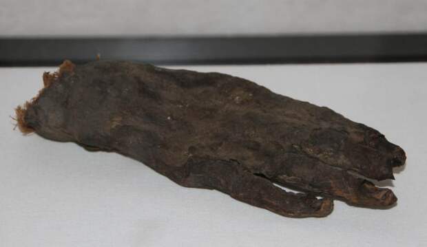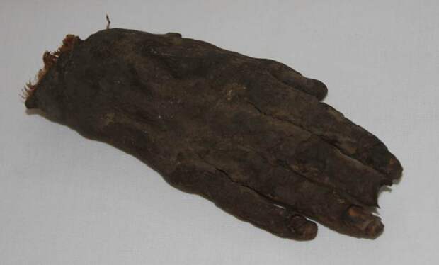 На рис.2.84-3 показана музейная табличка, а на рис.2.84-4 и рис.2.84-5 - сама отсеченная кисть. Табличка сообщает, что, согласно наиболее распространенной версии, эта мумифицированная рука была привезена из Святой Страны, то есть из Иерусалима, во время Первого Крестового Похода якобы 1099 года. Дальнейшая судьба этой реликвии окутана множеством средневековых легенд, см. текст на рис.2.84-3. В 2003 году Dr.Bruno Kaufmann, Antropology Research Institute of Aesch (BL), выполнил научное исследование, согласно которому, это - рука "древне"-египетской мумии, причем, она, оказывается, была отсечена острым предметом и принадлежала, вероятно, мужчине. Сказано далее, что темный цвет руки объясняется особенностями мумифицирования. Отмечается хорошая сохранность кисти, указывающая на тщательную ее обработку и качественную консервацию. По мнению исследователей, этот факт может указывает на то, что кисть принадлежала высокопоставленному человеку, "of a high rank".