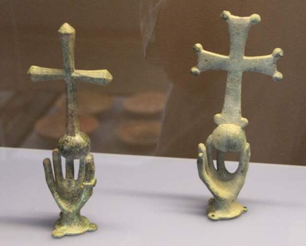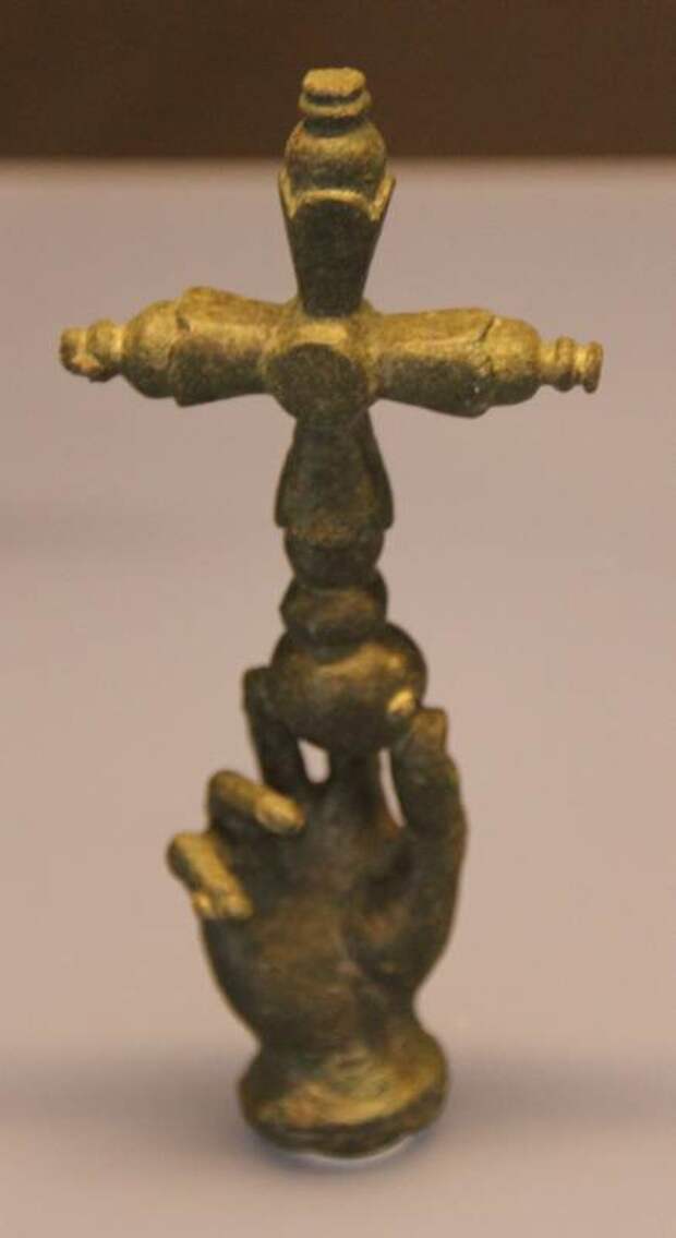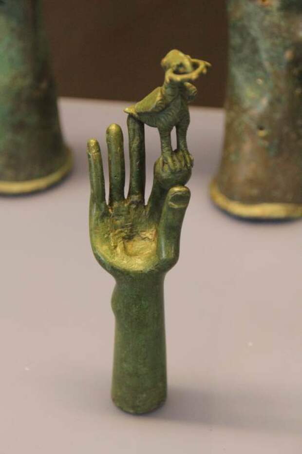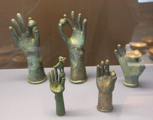 Теперь становится понятно, почему символ отсеченной руки с крестом или с другим культовым предметом (например, с шаром-Солнцем) был, согласно скалигеровской истории, весьма популярен в Византии II-VI веков. Бронзовые изображения такой священной руки известны под условным названием "вотивная рука". На рис.2.84-6, рис.2.84-7, рис.2.84-8, рис.2.84-9 приведено несколько примеров таких бронзовых предметов. Они выставлены в Музее Искусства и Истории г.Женевы. Скорее всего, это памятные изображения отсеченной руки Андроника-Христа. Их распространяли по храмам, где им поклонялись верующие.
