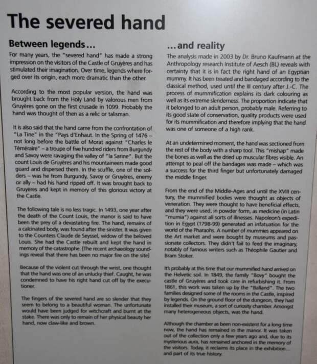 Приведем еще один яркий факт, вероятно, напрямую связанный с легендами об отрубленной правой руке Андроника-Христа. Во время посещения известного швейцарского замка Грюйер (Gruyeres), рис.2.84-1 и рис.2.84-2, в июле 2013 года, А.Т.Фоменко и Т.Н.Фоменко обратили внимание на мумифицированную отрезанную правую руку, выставленную в музее. По ее поводу путеводитель говорит следующее: <<В витрине вы видите знаменитую "отсеченную руку". Это рука одной из египетских мумий, о происхождении которой было сложено множество легенд>>.