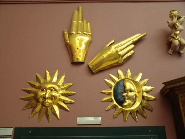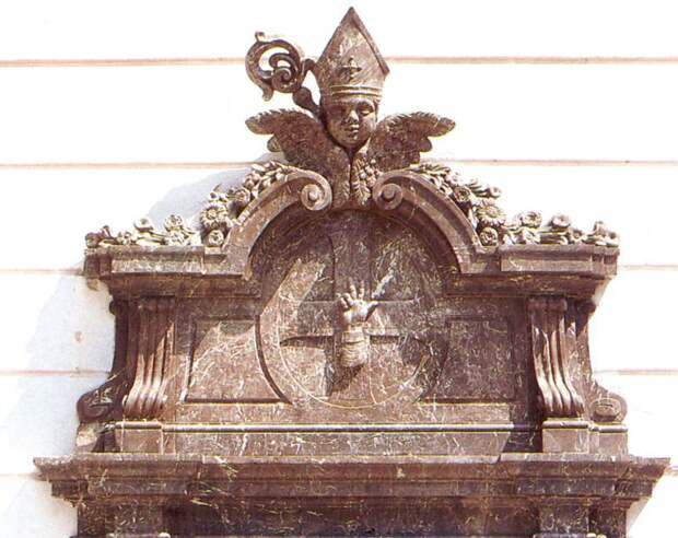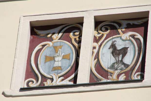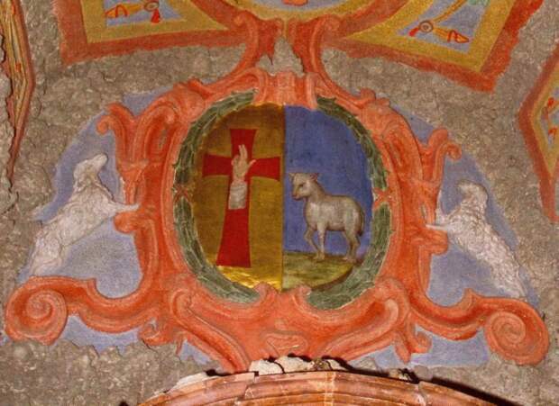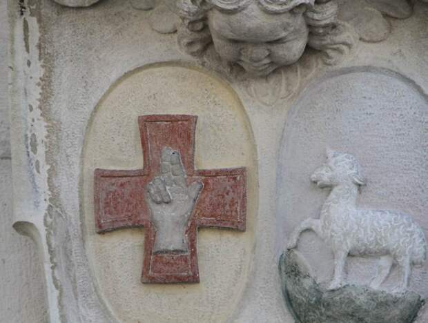 Отсеченная рука Иисуса оставила яркий след в христианской символике. В частности, в виде широкого креста, в центре которого помещена отрубленная правая кисть. Например, фотографии на рис.2.84a, рис.2.84b, рис.2.84c, рис.2.84d, сделаны нами в 2012 году в известном австрийском монастыре Святого Креста недалеко от Вены. На двух из этих рисунков рядом с крестом изображен Овен - символ Христа. См. также рис.2.84e.