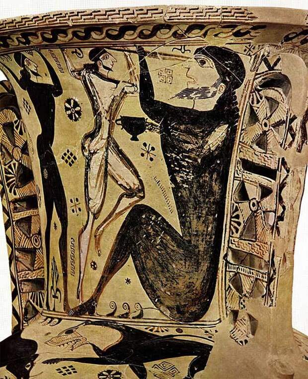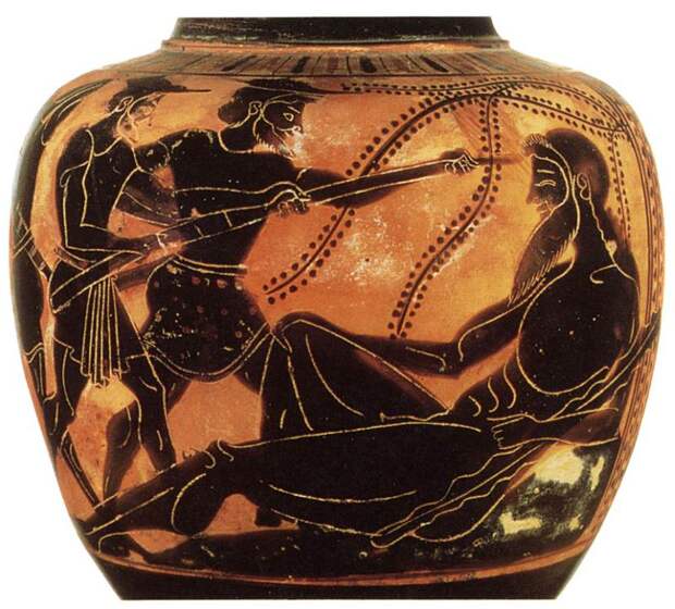 Возникает впечатление, что Хониат называет Андроника ЦИКЛОПОМ далеко не случайно. Скорее всего, мифологический Циклоп - это и есть Христос, которому перед смертью выкололи глаз. Христос был большого роста. Впоследствии народная молва создала на данной основе образ могучего одноглазого великана - Циклопа. На рис.2.74, рис.2.75 и рис.2.76 приведены рисунки с "древне"-греческих амфор - ослепление Циклопа Полифема. См. также рис.2.76a.