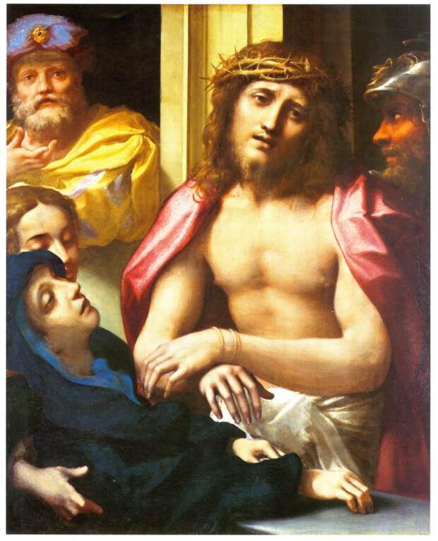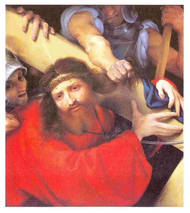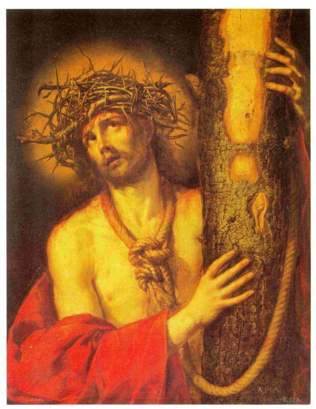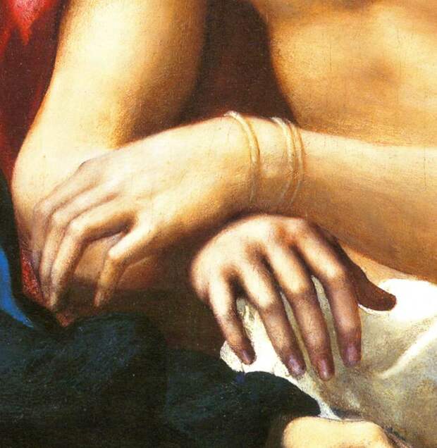 Нам пока не удалось найти старинного изображения Христа с отрубленной рукой. Однако сохранились некоторые изображения, на которых, вероятно, воспоминание об отрубленной руке Иисуса сквозит, причем иногда достаточно явно. На рис.2.79приведена, например, картина Корреджо "Ecce Homo". На голове Христа - терновый венец, Богоматерь находится в обмороке, рядом - воин. А на руке Христа мы с удивлением видим какую-то непонятую перевязь, вроде браслета из трех тонких колец, охватывающих руку и как бы отделяющих кисть от руки, см. рис.2.80. Данная деталь выглядит достаточно странно. Не исключено, что в таком виде до нас дошли смутные воспоминания об отрубленной руке Иисуса. Причем странная "перевязь" отмечена лишь на одной руке Христа. Во всяком случае, когда мы увеличили изображение, то никаких аналогичных следов на другой руке Иисуса нам обнаружить не удалось.