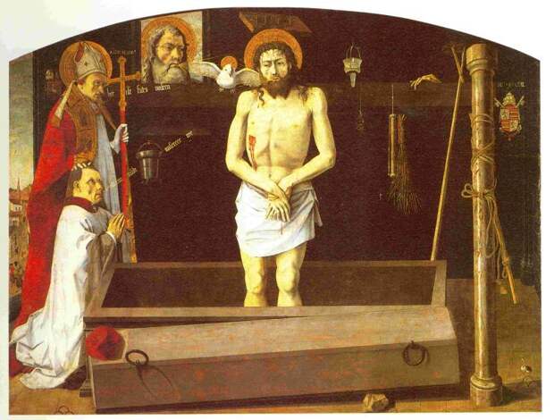 Далее, сохранились и более прямые свидетельства. Например, на рис.2.83 приведена старинная картина "Новозаветная Троица с мертвым Христом". Справа, на перекладине креста, мы видим ОТРУБЛЕННУЮ ПРАВУЮ КИСТЬ, положенную на крест! Хотя руки изображенного тут же Христа не повреждены в такой степени, однако сам факт присутствия здесь ОТДЕЛЕННОЙ ПРАВОЙ КИСТИ, скорее всего, указывает на то, что некоторые средневековые художники еще помнили, хотя и смутно, об отрубленной правой руке Иисуса, см. рис.2.84.