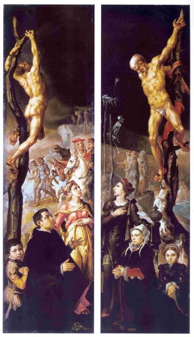 К столбам-крестам, согласно Евангелиям, были привязаны два разбойника, см. рис.2.86. А у "Хониата" вместо этого сказано, что столбы стояли подле двух каких-то "разъяренных медных статуй". Опять-таки здесь легко просматривается исходный евангельский текст. Но только вместо разбойников названы "волчица и гиена".