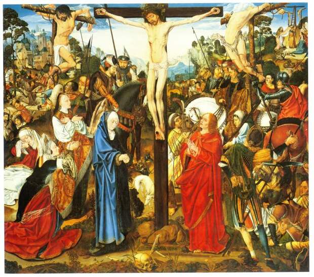 Здесь мы пока остановимся. Все мы знаем, что Христос был распят на кресте, стоящем посреди двух других крестов, к которым привязали двух разбойников, см. рис.2.85. Все три креста стояли на горе Голгофе. То есть, так сказать, на некоем "большом камне". Но вглядевшись в текст Хониата, мы видим, что тут описана в общем такая же картина, хотя в несколько искаженном виде. Сказано, что Андроник был повешен между двух столбов, соединенных сверху каким-то камнем. По-видимому, в исходном тексте было написано, что он был повешен между двух столбов, стоящих на каменной горе. То есть как бы "соединенных камнем", но не сверху, а снизу.