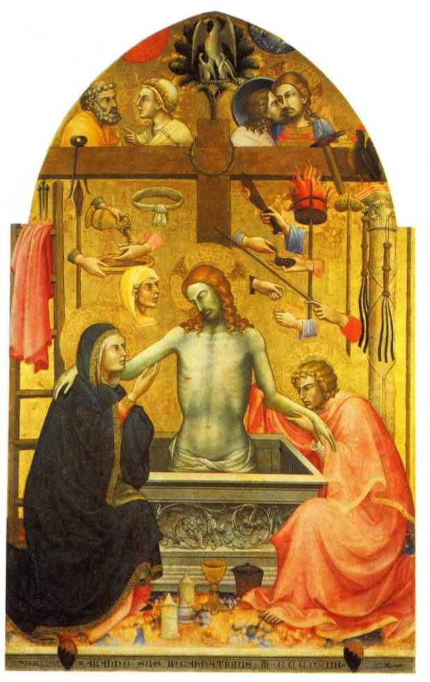 Напомним, что говорят Евангелия о снятии с креста и погребении Иисуса, рис.2.87b. Иоанн пишет: "После сего Иосиф из Аримафеи - ученик Иисуса, но тайный из страха от Иудеев, - просил Пилата, чтобы снять тело Иисуса; и Пилат позволил. Он пошел и снял тело Иисуса. Пришел также и Никодим... и принес состав из смирны и алоя, литр около ста. И так они взяли тело Иисуса и обвили его пеленами с благовониями, как обыкновенно погребают Иудеи. На том месте, где Он распят, был сад, и в саду гроб новый, в котором еще никто не был положен. Там положили Иисуса... потому что гроб был близко. В первый же день недели Мария Магдалина приходит ко гробу рано, и видит, что камень отвален от гроба. И так, бежит и приходит к Симону Петру и к другому ученику... и говорит им: унесли Господа из гроба, и не знаем, где положили его" (Иоанн 19:38-40; 20:1-2).
