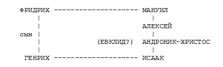 ) утонул в реке... наследовал царство своего отца, покорил Италию и затем... устремился против римлян (то есть против византийцев - Авт.)... Он отправил... к императору Исааку... послов с целью изложить причины явно беспричинного раздора... Он исчислял, с увеличением надлежащего веса, все огорчения своего отца, не только недавние, но и те, с которыми боролся его отец давно, когда ловкой политикой царя Мануила был оттолкнут от древнего Рима и вместе изгнан из всей Италии. Бесцеремонно поднимая эти ДОЕВКЛИДОВСКИЕ события, он хотел, чтобы римляне или купили у него мир за огромную сумму денег, или не жаловались, если он немедленно начнет с ними войну" [933:2], с.137.Давайте разберемся - какой Евклид здесь имеется в виду. Речь идет о переговорах между Генрихом и императором Исааком Ангелом. Генрих вспоминает старые обиды, нанесенные его отцу Фридриху, правившему за несколько лет до того, императором Мануилом Комнином. Никита Хониат возмущенно говорит, что Генрих-де вспоминает ДОЕВКЛИДОВСКИЕ времена. Отсюда прямо следует, что правление Мануила и дни Исаака Ангела могло быть названо ДОЕВКЛИДОВСКИМ временем. А следовательно ЕВКЛИДОВСКОЕ время попадает МЕЖДУ правлениями Мануила и Исаака. Но между Мануилом и Исааком было лишь кратковременное правление отрока Алексея и правление Андроника-Христа.