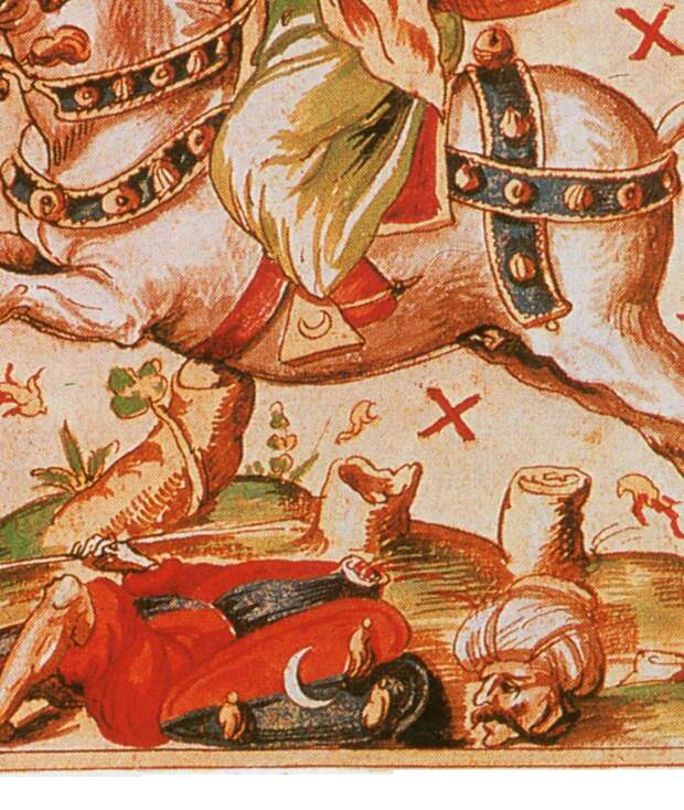 . Тем самым, Иаков представлен здесь как осман=атаман, которого в прямом и переносном смысле поддерживает полумесяц. С другой стороны, под копытами его коня валяется труп противника, на щите которого тоже виден османский полумесяц, рис.5.35