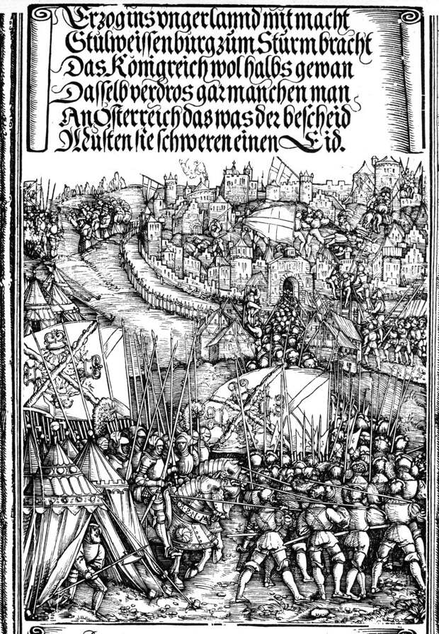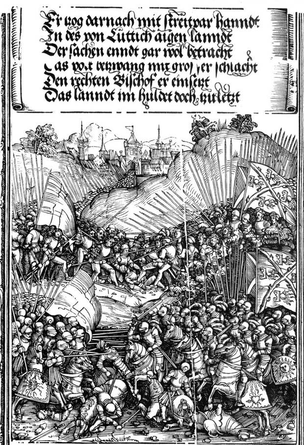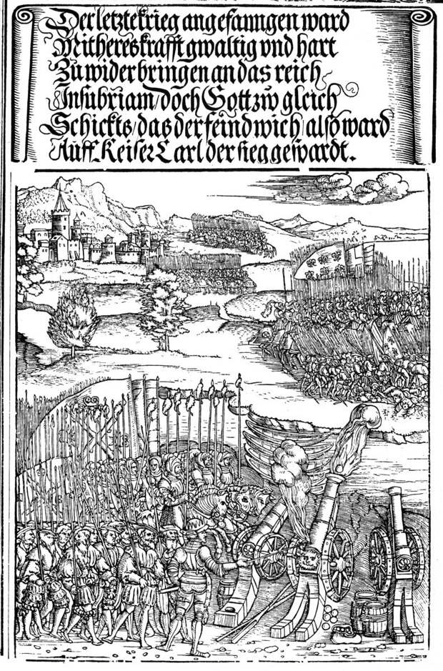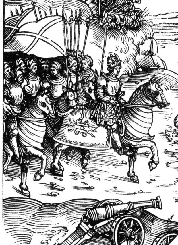 . Сегодня считается, что тут изображены европейские войны предшественников Максимилиана I. Теперь мы понимаем, что это - правда, но далеко не вся. Скалигеровская история старалась скрыть, что это было завоевание земли обетованной атаманскими войсками Иисуса Навина = Святого Иакова. В частности, на полях сражений, под стягами Иакова, мы видим большие ордынские пушки, ведущие огонь по неприятелю, рис.5.50