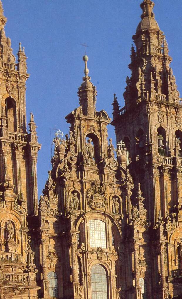 Собор Сантьяго де Компостела строили якобы несколько раз. "Первый римский храм" был возведен якобы в I веке. Потом разрушен. Что происходило в эпоху II-VIII веков считается практически неизвестным [1059], с.11-12. "Первый кафедрал" построили на этом месте якобы в 1075 году. Однако затем он якобы "существенно реконструировался" и в XII веке, и в XV веке, и в XVII-XVIII веках [1059], с.14. Так что грандиозный собор, который мы видим сегодня, возведен, скорее всего, не ранее XVII-XVIII веков.