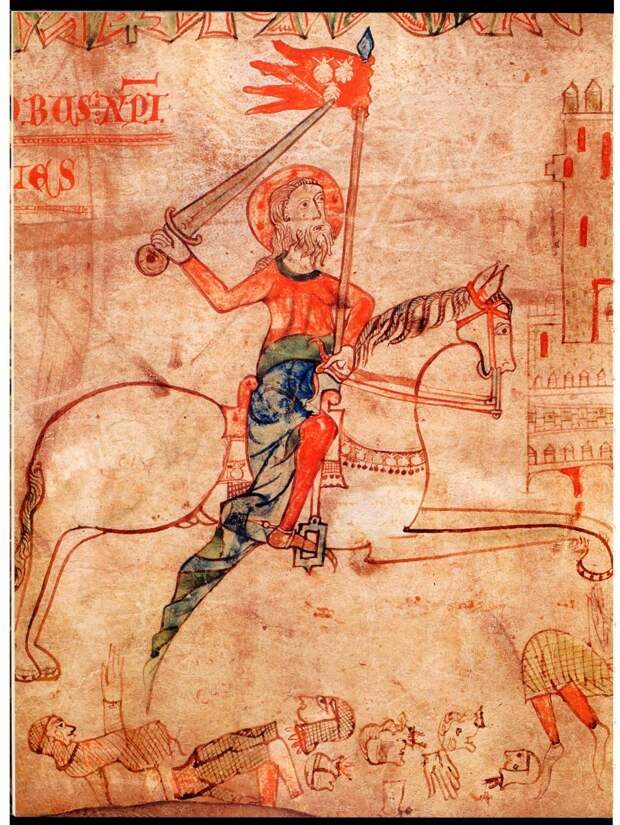 Сообщается, что во время "Реконкисты Апостол (Иаков - Авт.) стал Святым Покровителем Испании" [1322], с.9. Сохранились многочисленные старинные изображения, где Иаков представлен как реальный средневековый рыцарь, сражающийся с "маврами", "мусульманами". Как мы теперь понимаем, здесь нашли свое отражение междоусобные стычки в эпоху османского = "повторного" завоевания XV-XVI веков, то есть во время "Реконкисты". В частности, и на территории Испании. Мы приводим некоторые из изображений Иакова-рыцаря на рис.5.29