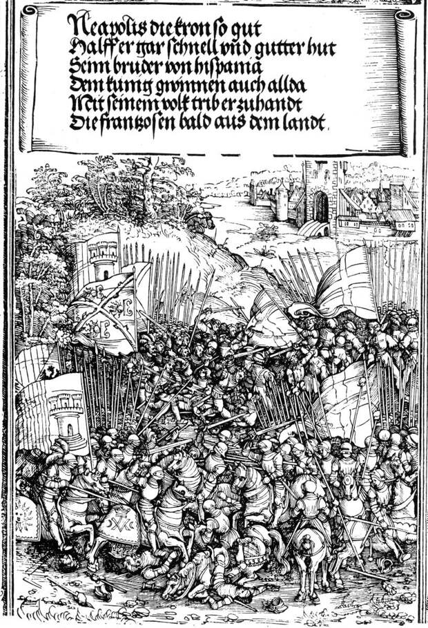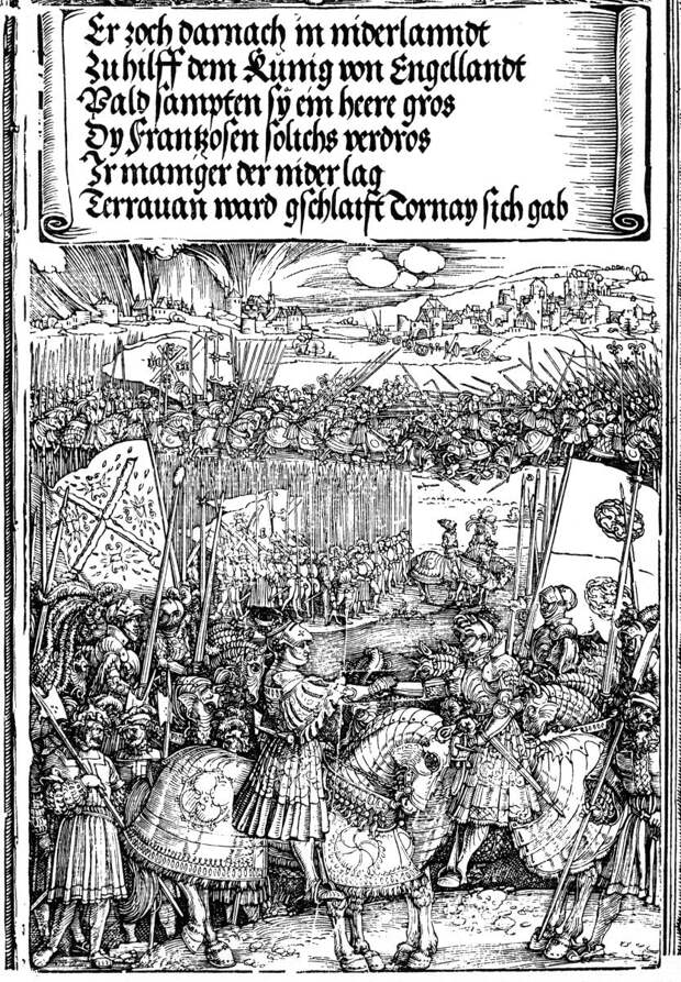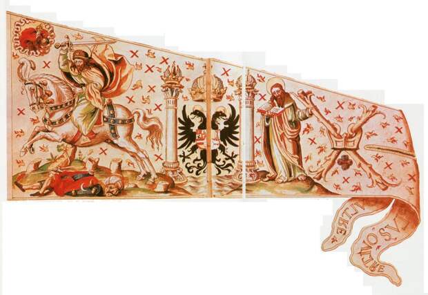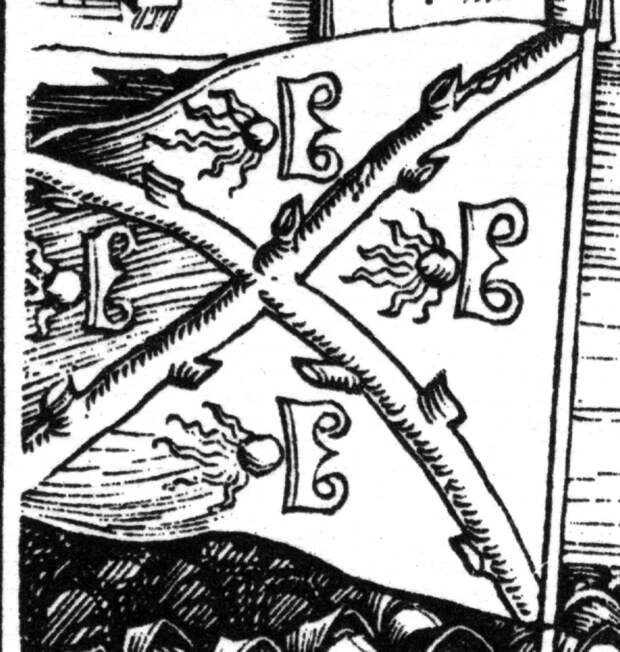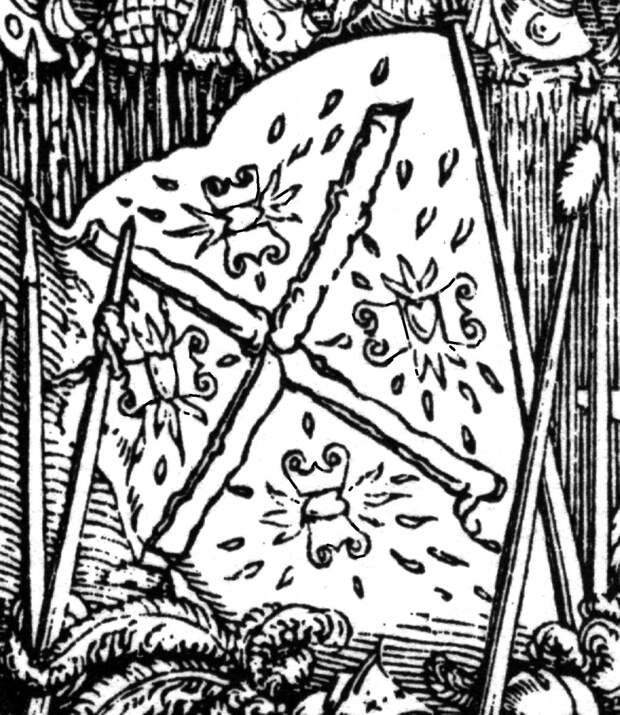 Косой русский крест Андрея Первозванного = крест Святого Иакова из перекрещенных сучковатых древесных стволов мы видим и над рыцарскими войсками в западно-европейских битвах XV-XVI веков. Например, он изображен на многочисленных гравюрах А.Дюрера, в составе его знаменитой "Арки Славы Императора Максимилиана I" (Ehrenpforte). Мы приводим некоторые из этих очень редких гравюр на рис.5.49