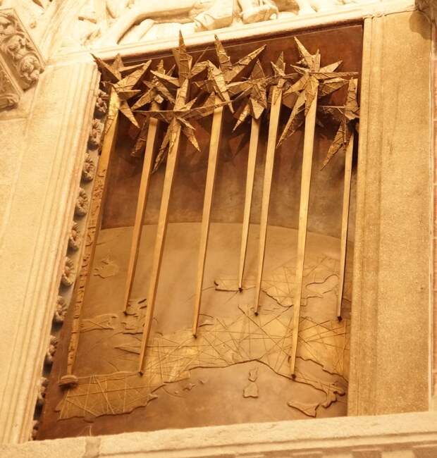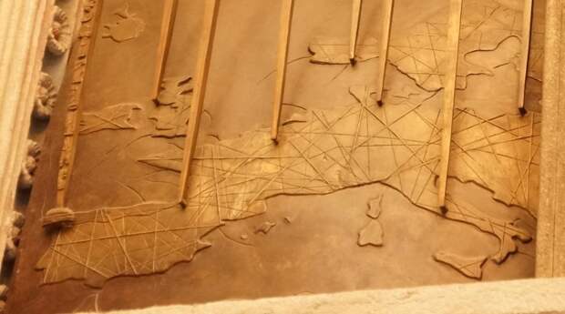 . Здесь рельефной металлической карты Европы пока еще нет. Не исключено, что раньше, в XV-XVI веках, тут была какая-то подобная карта, которую потом убрали. А в наше время на ее место поместили металлический дубликат или же карту, сделанную по мотивам старых изображений, бывших в соборе.