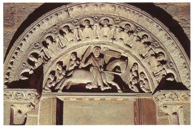 Та же идея, в еще более откровенной форме, реализована на каменных барельефах собора Сантьяго де Компостела. На рис.5.63