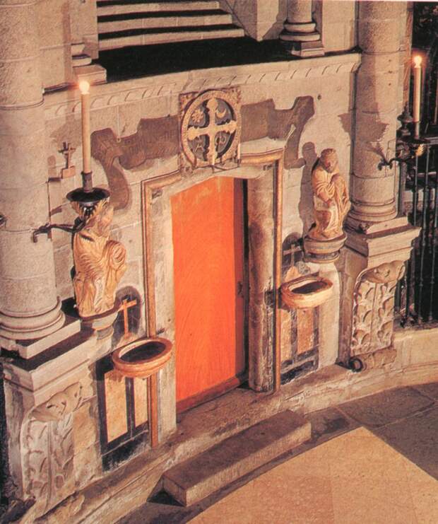 . Несколько лет тому назад под барельефом была пустая ниша, где, по-видимому, находилось какое-то изображение либо статуя. Или тут был оконный проем с витражами и старыми изображениями. Потом его могли заложить кирпичом. Ниша хорошо видна на фотографии из старого путеводителя по собору, рис.5.29