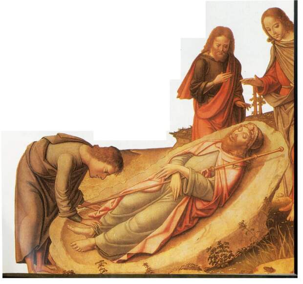 . Однако обратим внимание, что мы видим отнюдь не старые высохшие мощи, а тело только что умершего человека. Поэтому, скорее всего, Иаков скончался не ранее IX века, может быть, в XII-XIII веках. Дело в том, что самое старое живописное изображение этого события датируется якобы XII веком [1322], с.7. Так что никакой "тысячи лет забвения", скорее всего, не было. Согласно новой хронологии, Иисус Христос жил в XII веке. Следовательно, его апостолы жили в XII-XIII веках. Поэтому появление гробницы Иакова не ранее IX века не противоречит новой хронологии. С подобной ситуацией мы столкнулись и в истории захоронения Святого Матфея (см. книгу "Западный миф") и Святого Марка (см. "Античность - это средневековье", гл.1:6.6). Их тоже обнаружили в эпоху XII-XIII веков. На рис.5.20
